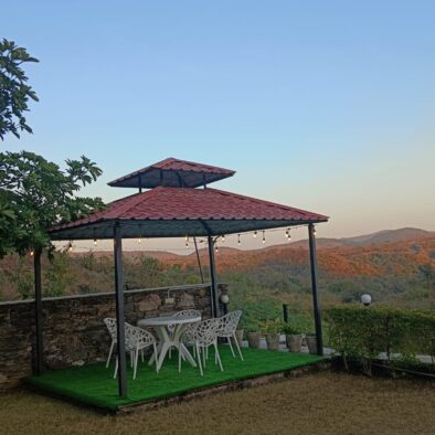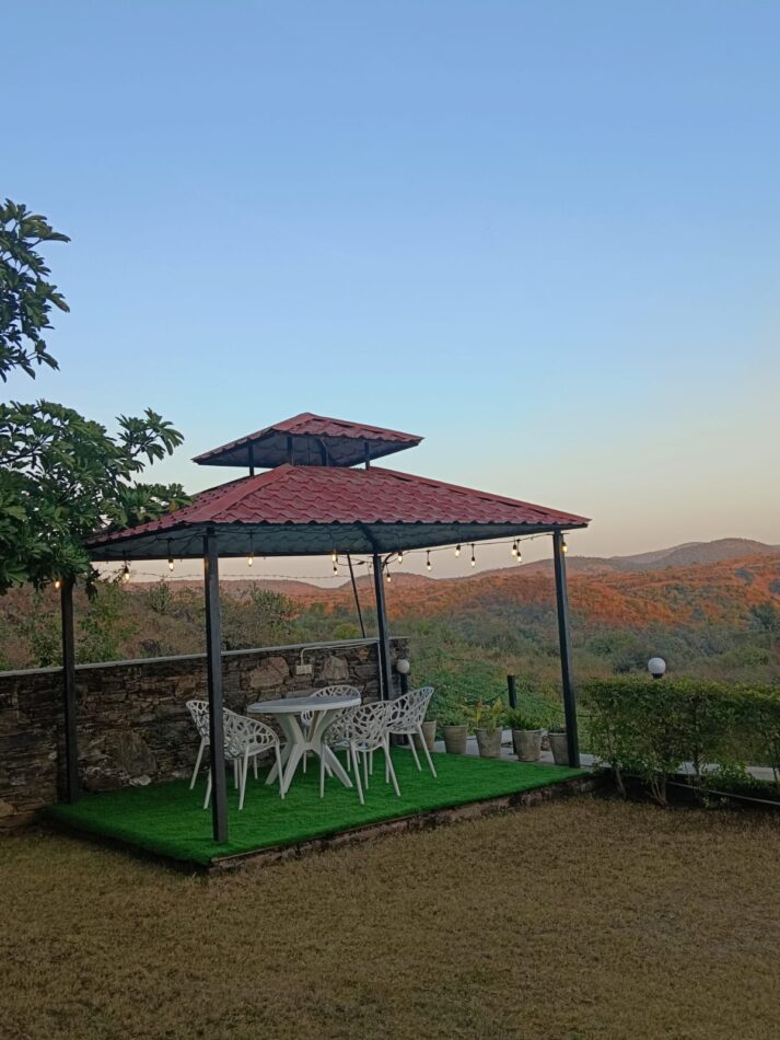 3 Spacious Gardens Open lawns for relaxation and outdoor activities Hillside gazebo-style seating with scenic hill views